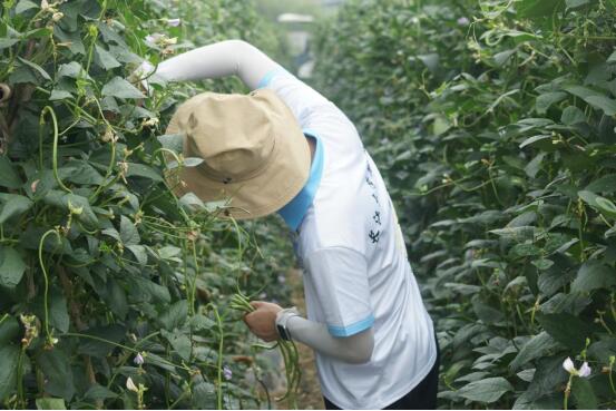 农场里,翠绿藤蔓缠绕支架,串串豇豆垂挂其间。实践队员们身穿统一服装,头戴草帽,手持皮筋,在农场主人的简单指导后,便满怀期待地踏入这片土地之中。