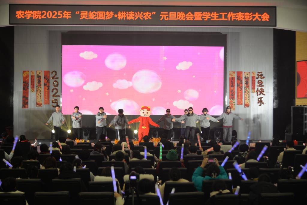 本次晚会以“灵蛇圆梦·耕读兴农”为主题,分为“携手共进·编织农梦”“凝心聚力·同耘农愿”“笃行志远·共续农情”三个篇章,每个篇章分别设“优秀学生先进个人”、“三早进先进个人”、“学科竞赛和三下乡先进个人”等颁奖,晚会中还穿插着三轮抽奖环节。师生共同登台,用歌舞、小品、诗朗诵、乐队表演等多种类型的11个节目,为现场观众带来了一场精彩的视听盛宴,彰显出农学人昂扬奋进的精神面貌。