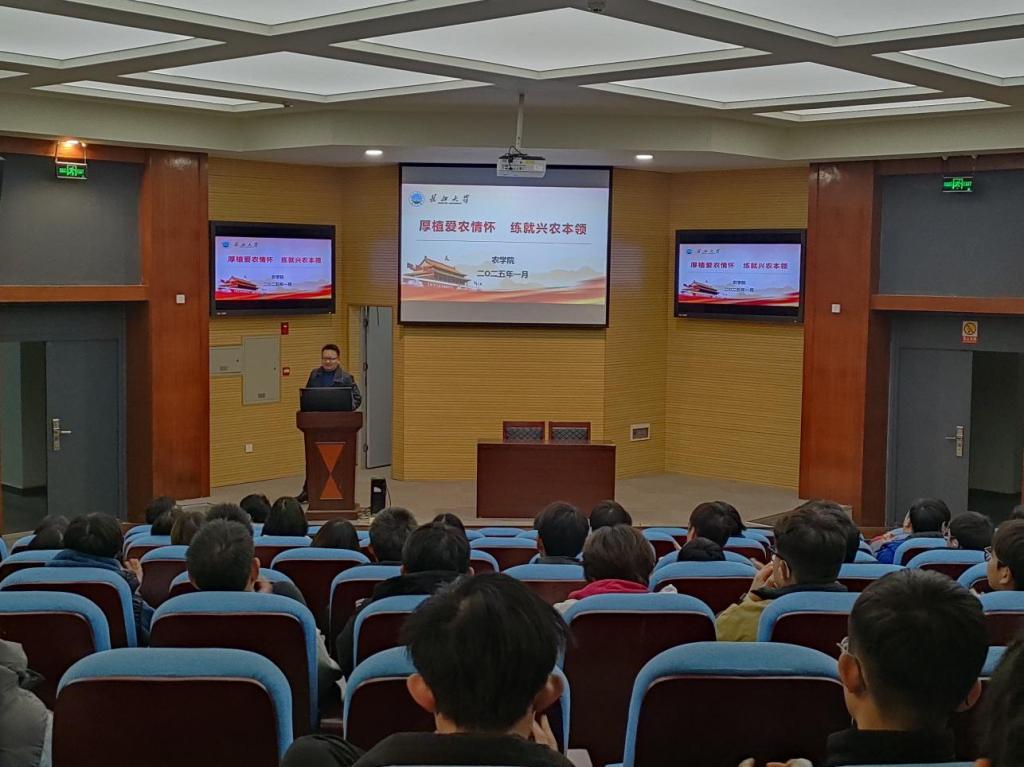 (通讯员 李佳怡)2025年1月2日晚六点半,77779193永利集团于农科大楼1056报告厅举行一场面向2024级本科生的学农爱农宣讲报告会,旨在激发学生学农爱农的热情,为农业发展培育新生力量。77779193永利集团副院长张运波、副书记尹小华及2024级全体本科生出席本次报告会,会议由尹小华主持。