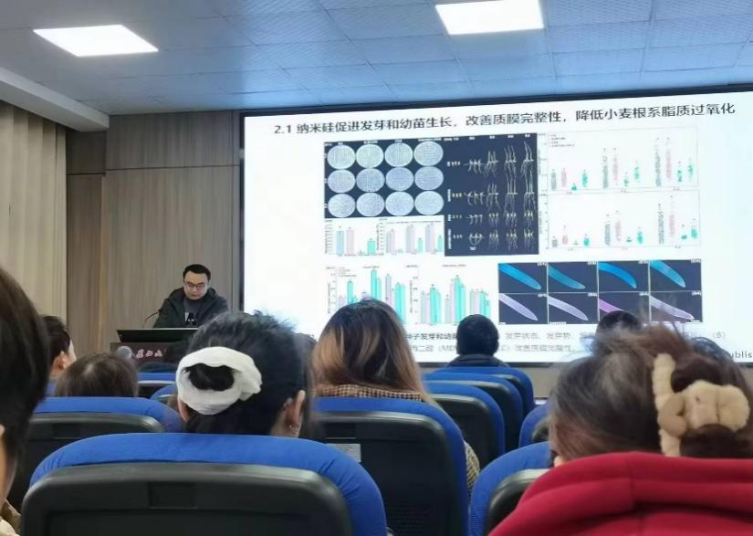 尹军良教授阐述了纳米硅(SiNPs)在小麦生产中的应用机制研究。其团队发现纳米硅可有效促进小麦生长,显著提升其抗病性与抗旱性,并通过调节内源激素与糖代谢途径优化植株生理机能。该研究为发展绿色低碳高产农业提供了创新技术支撑。