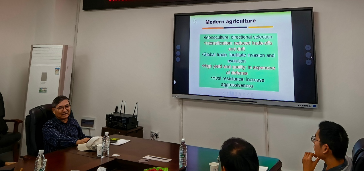 9月21日,詹家绥教授为植物保护系专任教师作题为《Applying DID principles for sustainable plant disease management》的学术报告,系统介绍“DID原则”在植物病害综合治理中的理论基础与实践路径,从生态学视角阐释如何通过多样性、互作调控等核心策略实现植物病害可持续防控。詹教授与与会教师围绕病害生态调控技术应用、跨学科合作路径等议题深入探讨。针对青年教师,他结合自身经验,就研究方向聚焦、项目申报难点等问题给出具体解答与方向指引。