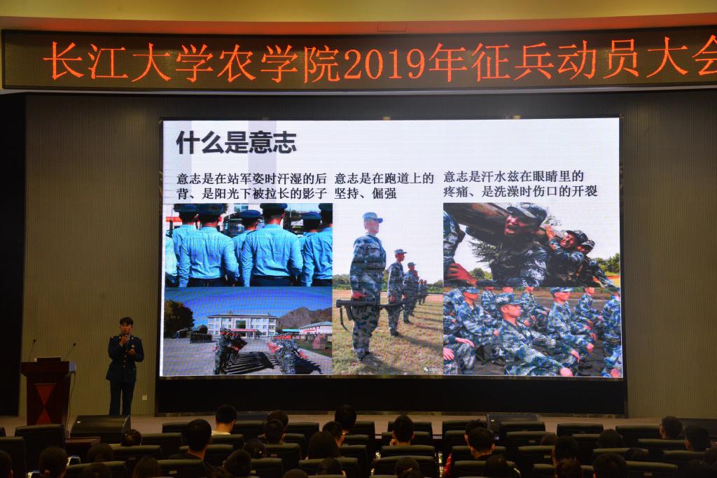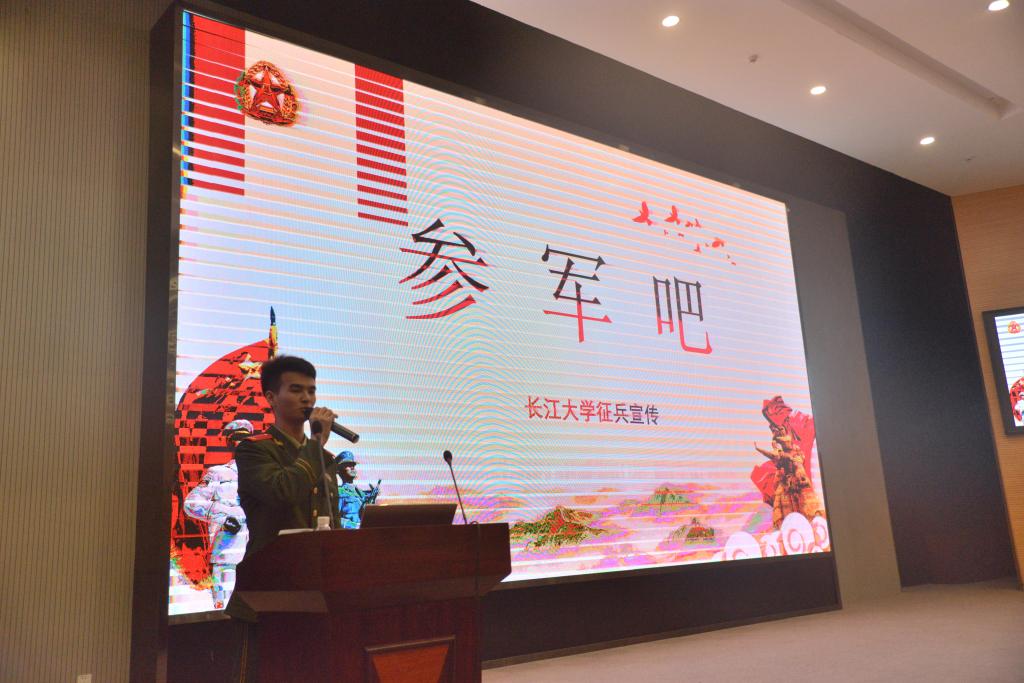 大会伊始,在主持人介绍本次大会的宣讲人之后, 伴随着铿锵的话语和干净利落的动作,第一位宣讲嘉宾张大才上台。张大才学长上台后便给同学们敬了一个军礼,然后用慷慨激昂的声音开始了他的演讲。他分别从他两年前的样子、他在部队的样子、部队给了他什么、自己应该是什么样子四个方面作了他的部队演讲。他告诉同学们,在部队中,他知道了什么是纪律、服从,什么是意志,什么是精神,什么是战友情。他最后还强调说:“青春的样子很多,很庆幸自己的青春有穿军装的样子。”紧接着,周纹彤学长上台作征兵演讲。首先,他就对同学们说:“参军后悔两年,不参军后悔一辈子”来激励同学们勇于报名参军。然后他从经济补助、复学升学、职业培训、就业安置四个方面讲述了参军后的优待政策。随后,他就讲了参军的条件标准与应征指南,让同学们对参军有了初步认识。最后,大四学姐谭思阳上台作征兵宣传,她希望同学们能勇于报名参军,并告诉同学们,相信参军可以给同学们带来自己想要的结果。在三位宣讲人扣人心弦的演讲结束后,全场响起热烈不绝的掌声。