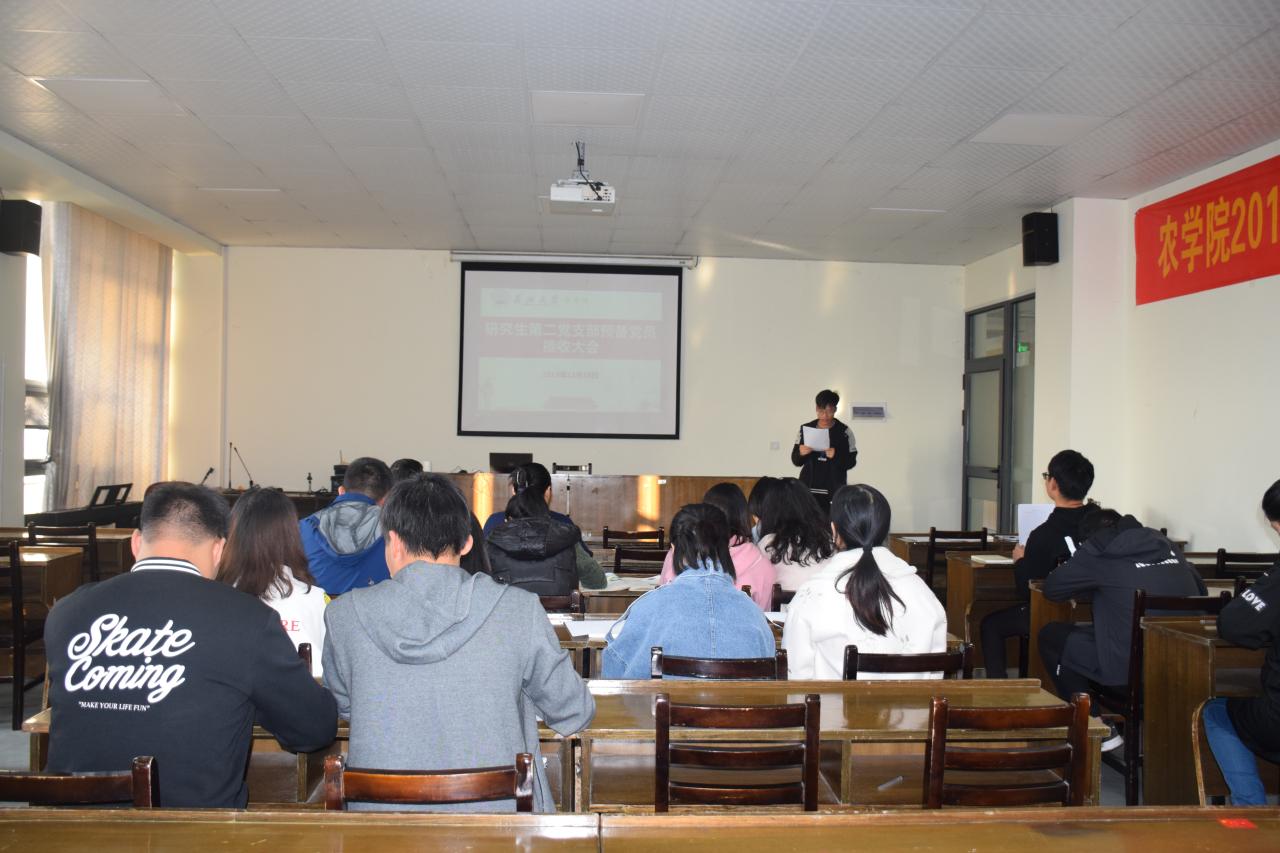 通讯社讯(通讯员 康珍 于欢)我院研究生第一党支部和第二党支部预备党员接收大会分别于11月17日19:00在农科大楼3071,11月15日16:00在农科大楼3073召开,参加会议的有第一党支部书记吴钐、第二党支部书记付雪娇、第二党支部副书记施秀飞和全体研究生党支部成员。