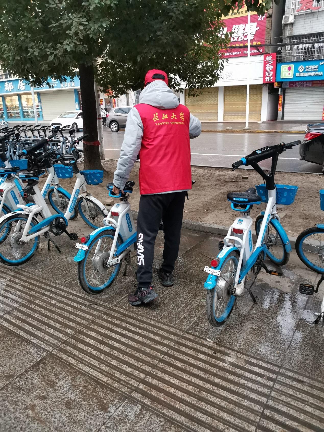 学生会干事两人一组,引导同学们停放好单车,又将乱停放的单车摆放整齐,并自发地捡起被乱扔在地上及角落的烟头、纸袋等垃圾,有的干事甚至特意准备了小垃圾桶放在学校门口,既方便了自己又方便了他人。