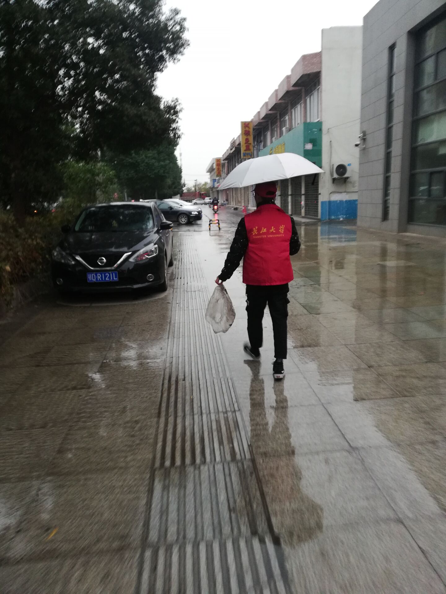 执勤进行的第二天,同学们就遇上荆州席面而来的“妖风”和连绵不断的小雨。寒风凌冽,风雨凄凄,“小农人们”依然身穿红色“铠甲”,分秒不逾地坚守在各自的岗位上。在这狂风阴雨连绵的校园里,干事们风雨无阻地参加执勤工作,这种乐于奉献、不畏困难的行为,如同缕缕暖阳照进人们心里,展现了我院学子良好的精神风貌。