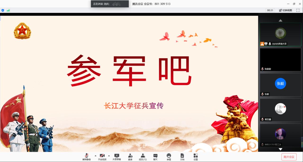 通讯社讯(学生记者 张毅)为进一步推进我院学生征兵政策宣传工作,帮助学生了解、掌握应征入伍相关政策和流程,5月29日19:00,我院通过“腾讯会议”平台开展了线上征兵政策宣讲活动。此次宣讲会由学工办主任刘庆主讲,本科班各班长、团副、今年报名应征和有入伍意愿的学生共同参与了此次宣讲会。