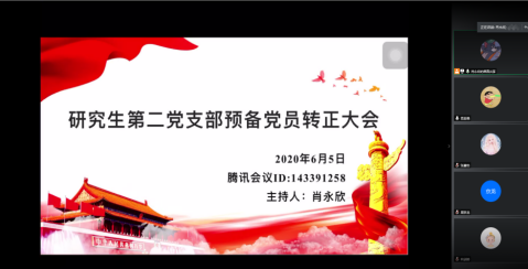 通讯社讯(通讯员 高亚强)为加强党组织建设,壮大党员队伍,6月5日下午,我院研究生第二党支部利用腾讯会议召开预备党员转正大会。本次会议对裴东方、向谈婷、向兰香3名预备党员发展为正式党员进行讨论和表决。研究生第二党支部正式党员、预备党员参会,会议由支部副书记肖永欣主持。