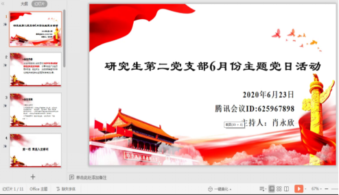 通讯社讯(通讯员 高亚强 周志雄)为深入学习贯彻习近平总书记重要讲话及有关文件精神,引导和激励广大党员履职尽责,奋发有为,我院研究生第二党支部于6月23日下午通过腾讯会议,线上开展了6月份支部主题党日活动。全体正式党员及预备党员参与此次活动,会议由支部副书记肖永欣主持。
