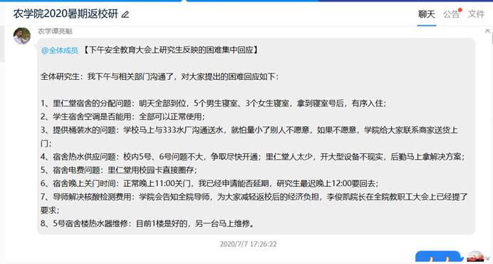 在互动环节,研究生针对返校后的宿舍调配、食堂就餐、热水供应、电费上缴、饮用水供应、核酸检测费用等问题进行了反映,党委副书记谭亮魁与研究生线上互动,逐条回复,并在会后立即与后勤保障部负责人、研究生导师进行了沟通协调,通过研究生返校专用QQ群进行了回应。