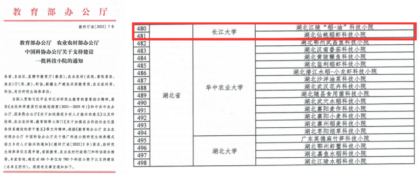 新闻网讯 近日,教育部办公厅下发《教育部办公厅农业农村部办公厅中国科协办公厅关于支持建设一批科技小院的通知》,我校申报的“湖北江陵‘稻—油’科技小院”和“湖北仙桃稻虾科技小院”获得建设支持。