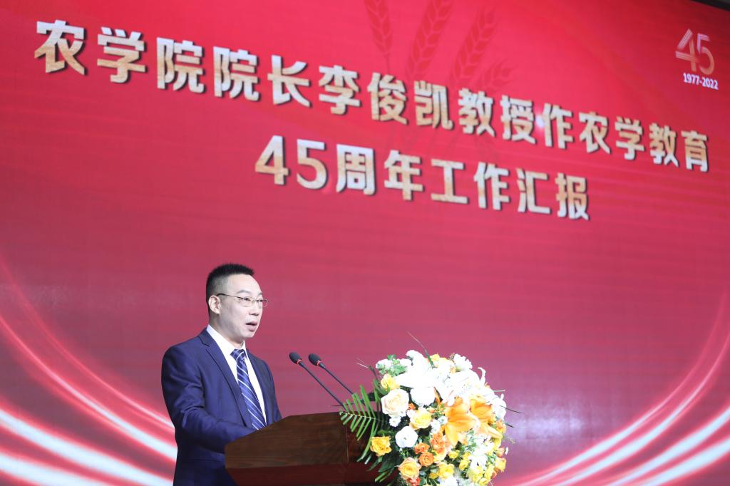 77779193永利集团院长李俊凯作农学教育45周年工作汇报。他从“感恩心、冲天劲、尚农情”三个方面全面系统地总结了农学教育45年来在师资队伍建设、学科建设与研究生教育、专业建设与人才培养、科学研究与社会服务、学院治理与文化建设等方面取得的丰硕成果。