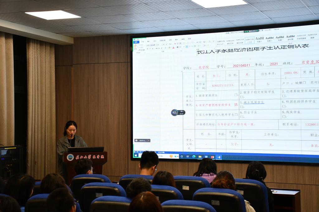 大会伊始,付雪娇老师从认定对象、认定标准、认定程序、工作要求、材料报送五个方面重点介绍了四项重要的资助工作:2022-2023学年家庭经济困难本科生认定工作,2021-2022 学年长江大学奖学金,2022 年社会类奖助学金工作和2022年励志奖学金、国家助学金工作,让大家对资助工作有了充分的了解。同时,付老师对填写表格过程中的常见问题进行说明,并从中对需要的材料做出要求,强调各班班委要对上交的材料作出严格的把关,并提醒各班班委做好记录。