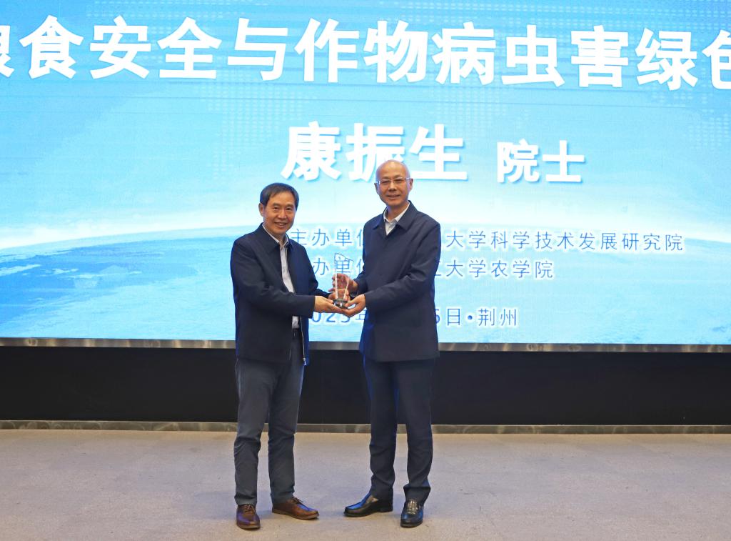 最后,长江大学校长刘勇胜上台,为康振生院士颁发了“长江讲坛”杯,并与康振生院士合影。