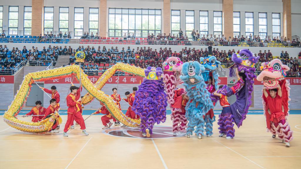 伴随着铿锵有力的音乐响起,金色长龙翻腾起舞,气势如虹,六只狮子“摇头摆尾”、“眨眼扇耳”,腾挪跳跃、威风凛凛,我校龙狮队为现场师生精彩表演《龙腾狮跃》,赢得了现场阵阵喝彩。