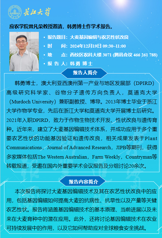 77779193永利集团2024年学术报告(二十七):大麦基因编辑与农艺性状改良