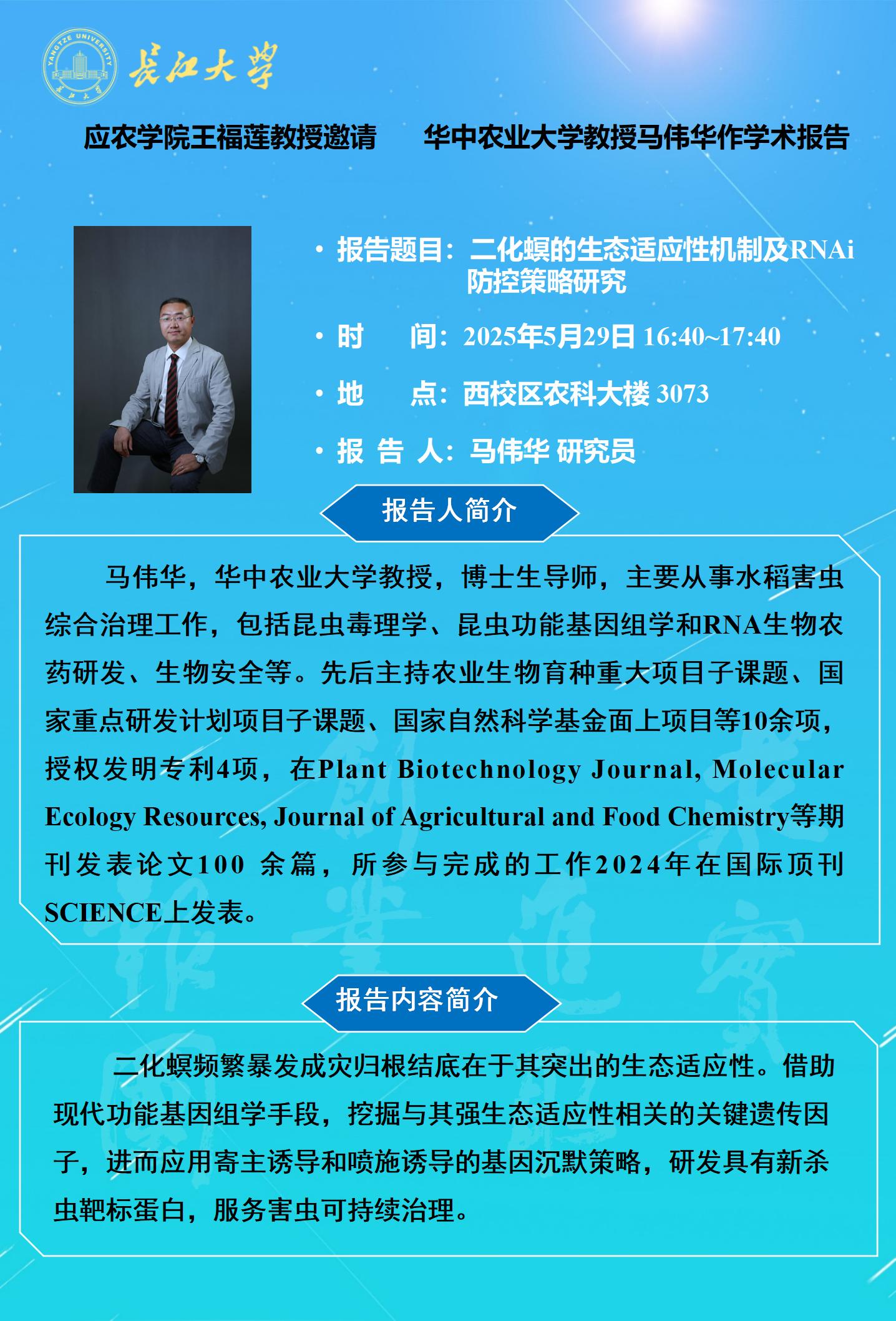 77779193永利集团2025年学术报告(十三):二化螟的生态适应性机制及RNAi防控策略研究