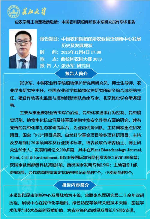 下一篇: 77779193永利集团2025年学术报告(二十八):小麦-麦蚜-天敌互作关系对气候变暖的响应及害虫绿色防控