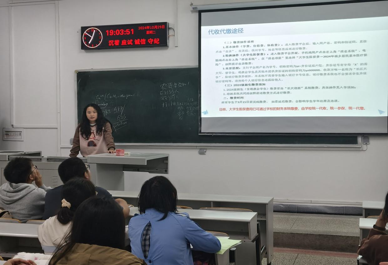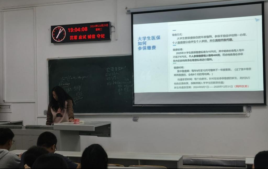 通讯社讯(通讯员 王雅莉 张新怡)为加强本院学生对大学生医疗保险的认知,了解正确使用医疗保险的方法,切实保障我院学生权益,我院于10月29日晚19:00,依次在学院新生各班的自习室进行宣讲,开展了以“大学生医保知识”为主题的宣讲活动,此次活动由2024级辅导员唐玉婷主持。