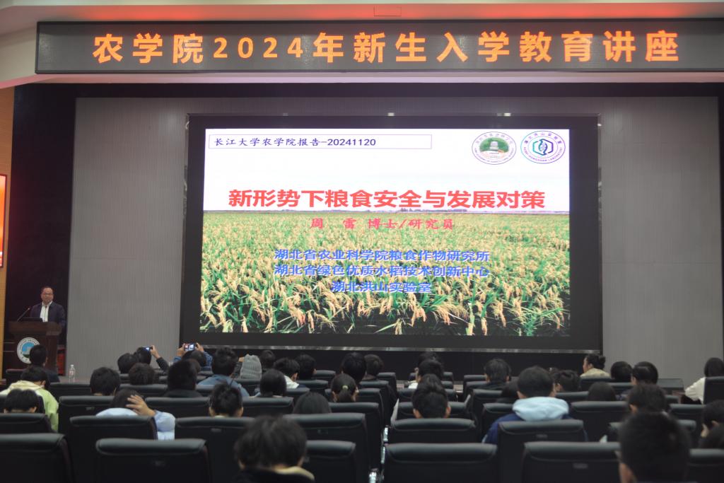 (见习记者 郑怡乐/文 吴静宜/摄)为加深新生对农科专业的认知,了解专业未来发展的方向,11月20日晚7点,我院于农科大楼1058进行了“新形势下粮食安全与发展对策”主题讲座。本讲座由中国青年五四奖章获得者、湖北省农业科学院粮食作物研究所研究室主任、研究员周雷进行报告,由院党委副书记尹小华主持。77779193永利集团副院长张运波、农学系朱波教授、邱先进教授及2024级全体本科生出席本次讲座。