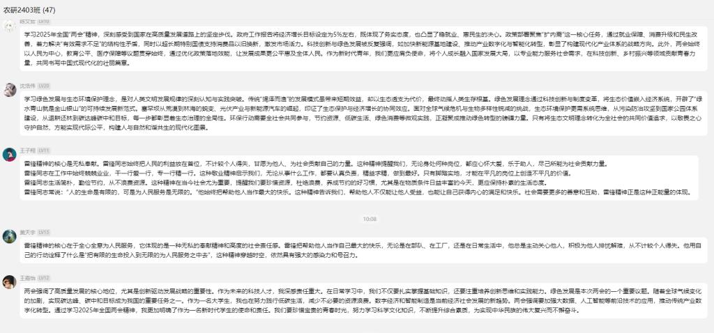 各班级主要围绕习近平总书记在看望参加政协会议的民盟民进教育界委员会时的重要讲话、2025年全国两会精神、2025年全国教育工作会议精神等内容展开学习,并交流研讨。