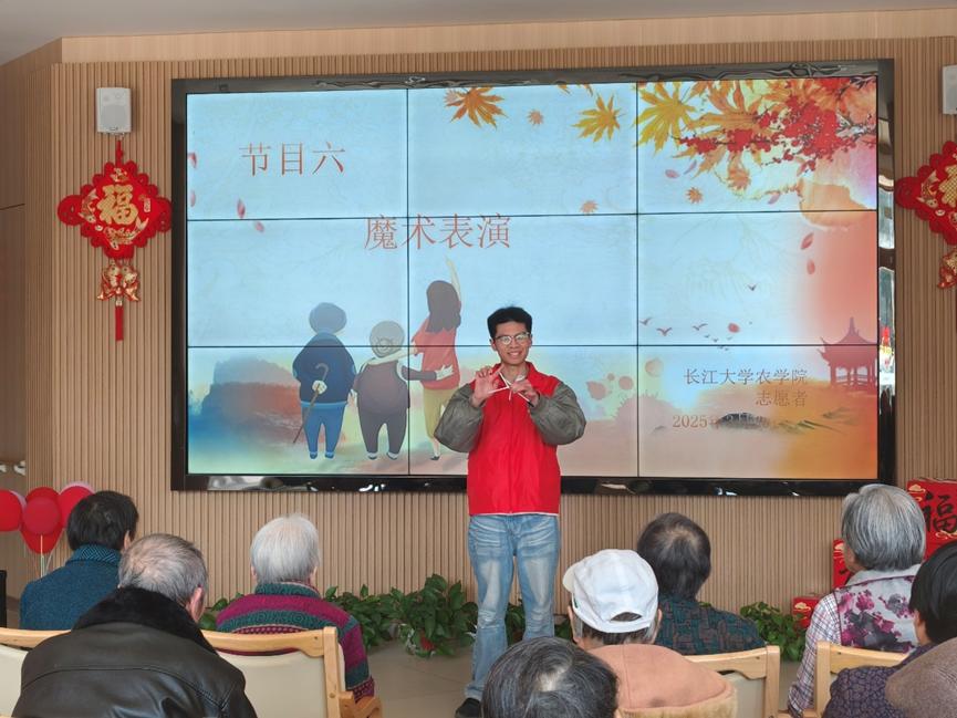 紧接着,魔术表演将活动推向了高潮。三位志愿者轮番上阵,以精巧的手法、奇幻的表演,让老人们惊叹不已,掌声与欢呼声此起彼伏,将现场氛围推向了顶点。