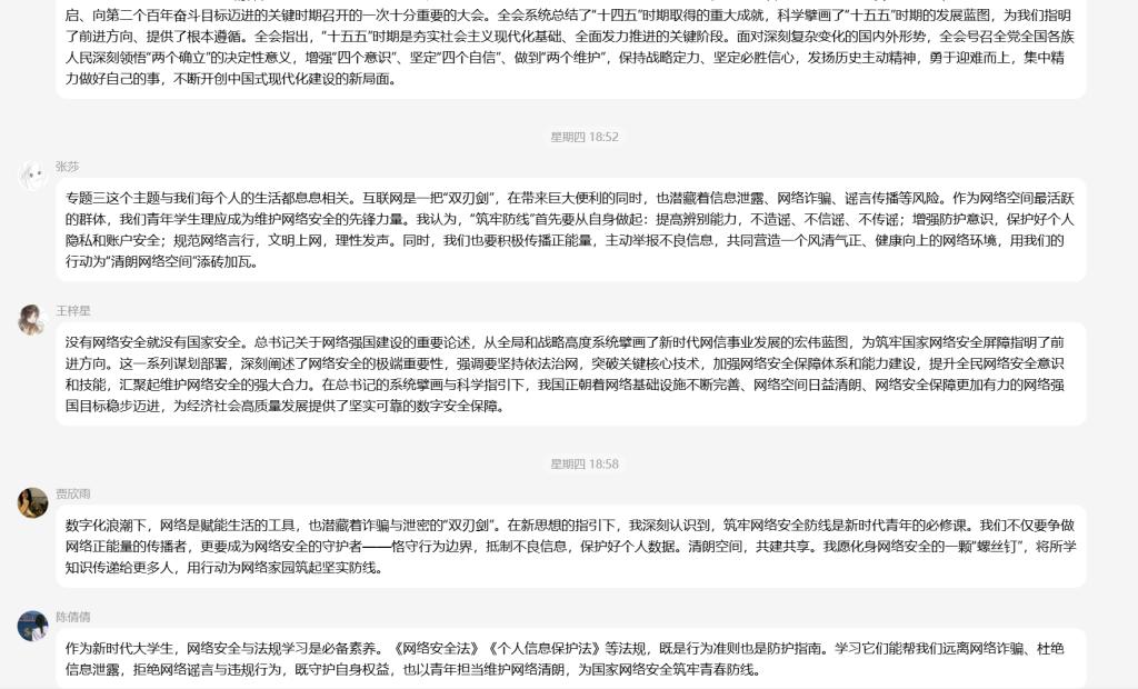 活动中,各团支部聚焦学习重点,掀起理论学习热潮,全体研究生深入学习习近平总书记的重要讲话和重要指示批示精神,深刻领会新思想新论断新要求。同学们围绕《求是》杂志发表的习近平总书记重要文章展开深度研学,纷纷表示要将个人理想融入国家发展大局,以研究生的专业所长为破解全球发展赤字、安全赤字贡献青春智慧。在网络安全主题学习环节,同学们通过解读《网络安全法》、《个人信息保护法》等核心条款,剖析学术数据泄露、网络诈骗、不良信息传播等典型案例,让同学们深刻认识到网络安全的重要性。各团支部还引导同学们要树立“共同、综合、合作、可持续”的安全观,掌握辨别网络风险、保护个人信息的实用技能,自觉成为清朗网络空间的建设者和守护者。