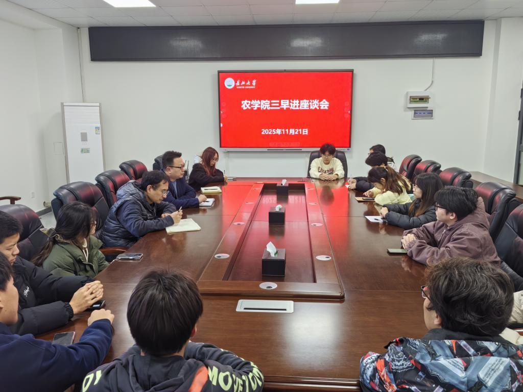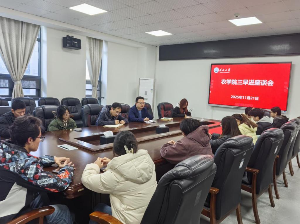 (通讯员 邹芮/文 唐玉婷/摄为践行“厚德笃行、丰食天下”院训,深化我院“三早进”(早进课题组、早进实验室、早进试验田)工作,促进新生厚植学农爱农情怀,坚定强农兴农的时代使命,我院于11月21日中午12:30在农科大楼3064召开了三早进座谈会。党委副书记尹小华、副院长邓建新、辅导员唐玉婷以及2025级和2024级全体班长参加了此次会议。
