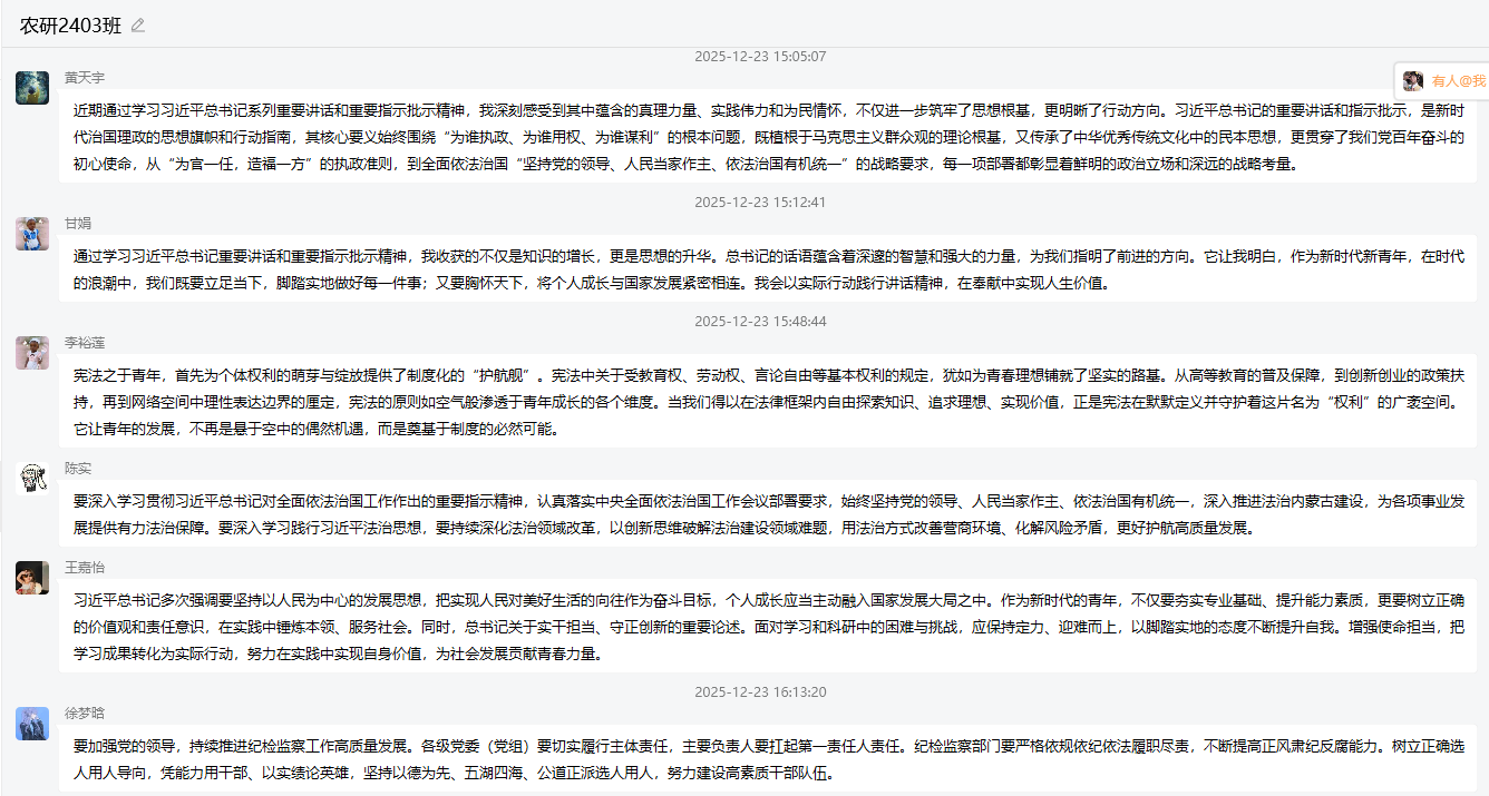 活动中,各团支部聚焦学习重点,掀起理论学习热潮,全体研究生深入研读了习近平总书记系列重要讲话和重要指示批示精神,包括在中共中央举行纪念胡耀邦同志诞辰110周年座谈会上的讲话、对全面依法治国工作作出的重要指示、在听取海南自由贸易港建设工作汇报时的重要讲话等,深刻领会新思想、新论断、新要求。同时,同学们认真学习了《求是》杂志发表的习近平总书记重要文章《推进党的自我革命要做到“五个进一步到位”》和《因地制宜发展新质生产力》,从中进一步把握了中国共产党人忠诚于党、心系人民、求真务实的精神品格,深刻认识了以自我革命引领时代发展、以科技创新培育新质生产力的时代内涵。此外,大家还学习了《中共长江大学委员会关于深入学习宣传贯彻党的二十届四中全会精神的通知》,研读了《习近平谈治国理政》第五卷第十一章《推进国家安全体系和能力现代化》相关内容,并回顾了习近平总书记在浙江工作期间关于意识形态工作的重要论述及实践探索。