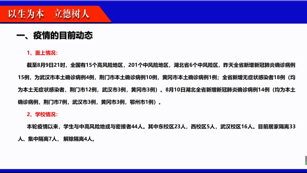 8月7日晚上8:30,学工办主任刘庆利用腾讯会议向全体辅导员传达了学工部的疫情防控会议精神,对党委学工部副部长谢作喜提出的工作任务进行了布置,党委副书记谭亮魁对相关要求进行了补充。