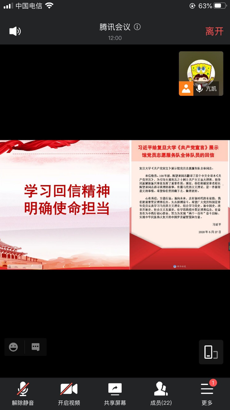 截止8月30日,我院农科学子除新疆籍外均已正常返校。9月,我们将开启新的学期,团日活动如期而至。本月的团会是2020年秋季的第一次团会,我院采取了线上线下相结合的方式开展本次团会。由于第一周属于宿舍观察期,农学产31901团支部于9月6日通过“腾讯会议”开展了本次团会活动。伊始,主持人亢凯介绍本次活动的主题,带领本团支部学习了习近平总书记在6月27日给复旦大学《共产党宣言》展示馆党员志愿服务队全体队员的回信。