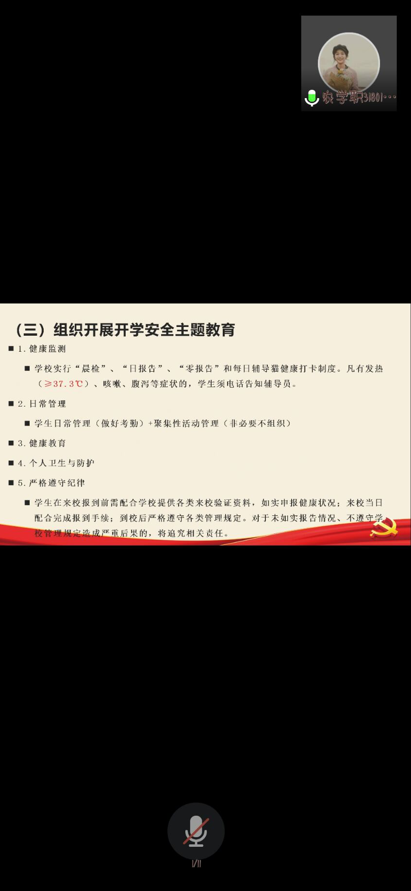 农学职31801班积极参与本次团日活动,在会议期间,与同学们交流了相关的安全防护知识,包括每日坚持打卡上报体温,有特殊情况及时告诉辅导员等事项。新学期,新希望,主持人更是强调了学校的日常管理和纪律问题,望同学尽快恢复学习状态。