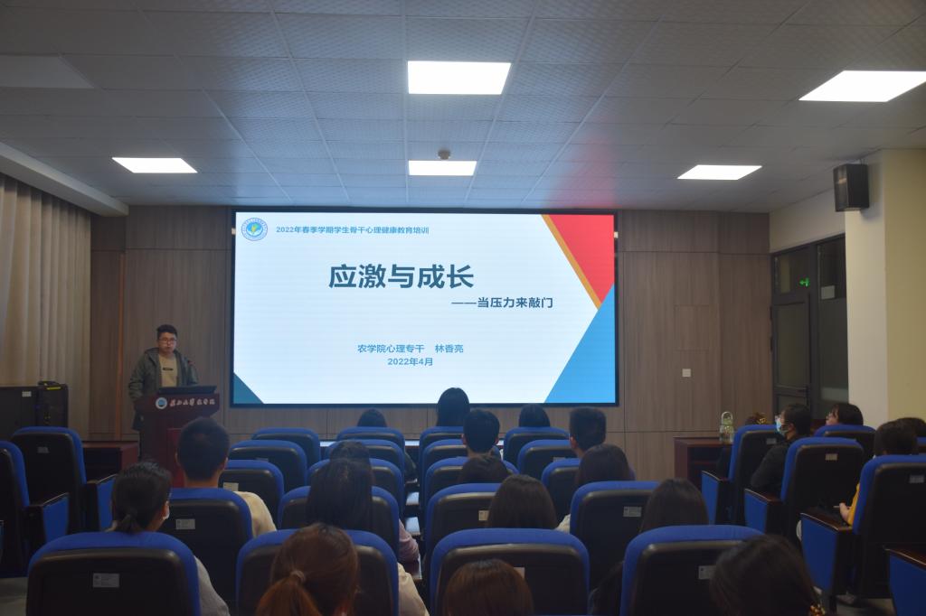 通讯社讯(见习记者 周微俐)为切实做好春季学期的学生心理健康教育工作,落实常态化疫情防控形势下的心理适应与行为引领要求, 4月29日,我院开展《应激与成长—当压力来敲门》学生骨干心理健康培训,心理专干林香亮主讲。