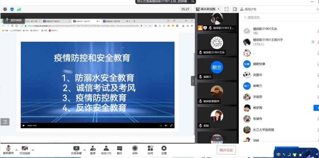 6月4日12时30分,农资31801班王雨晴在本次线上班会中提到注意防盗、防骗、防抢及用电、用火、用气、涉水、交通等安全问题;求职择业过程中要提高警惕、防止受骗或误入传销组织,并与家人或学校保持密切的联系;离校出行要注意交通安全,通过正规渠道购买返乡车票,不乘坐无证无牌及超载车辆;严格做好疫情防护,确保自身安全。最后在班会结束时,她祝愿全班同学们前程似锦,开创更加美好的未来!