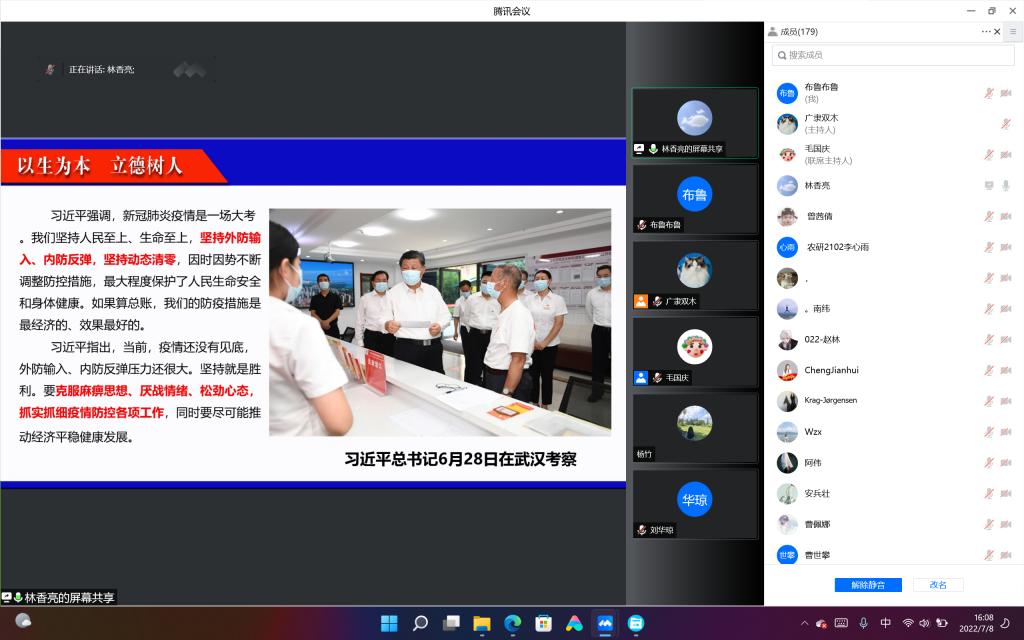 党委副书记尹小华对留校研究生提具体要求。要遵守纪律,服从疫情防控等校园安全管理规定,要坚持每天健康打卡,出现发热等紧急情况要第一时间上报。要注意安全,暑期期间要注意防火、防中暑、防蛇咬等。要提高学习效率,留校期间应当净心、静心、尽心,潜心学术,科学生活。要提早谋划就业,针对当前自身存在的短板,利用暑假查漏补缺,提高自身的核心竞争力。
