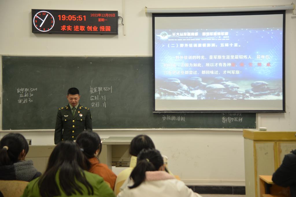 宣讲员杨沧达从征兵条件、报名流程、优待政策等方面为现场同学做了详细介绍。他结合自身经历,分享了自入伍到退役所受到国家的优惠优待等,鼓励有志青年要积极投身国防事业,实现我国强军梦。
