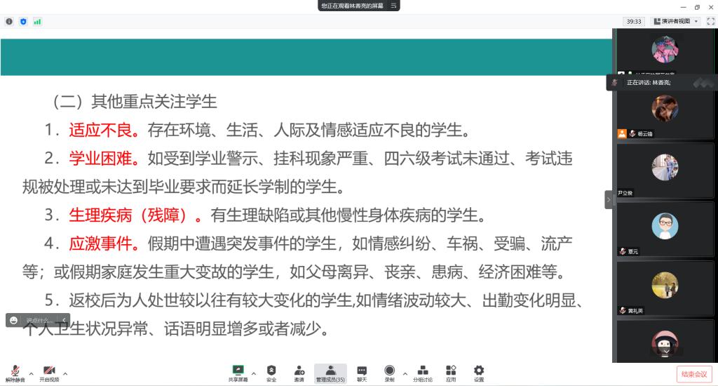会议开始,各年级辅导员就近期要开展的主要工作进行了介绍,主要涉及学生开学工作安排、返校后的教育管理、学生心理危机预警排查、学生心理教育、安全教育、就业工作、寝室文明卫生建设、学风建设等工作。