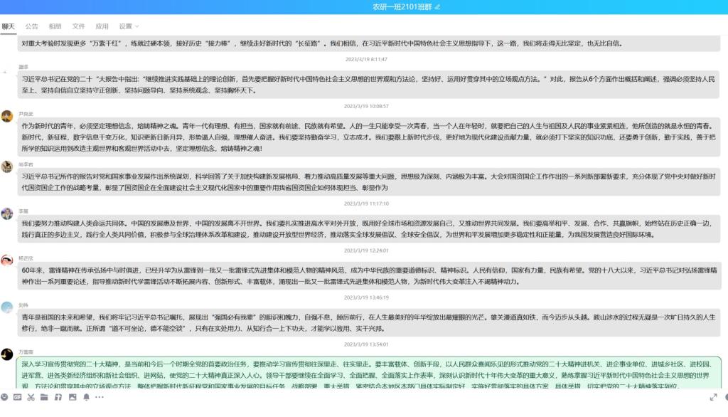 在集体讨论过程中,各团支部成员踊跃讨论交流自己的想法与收获。农研2104团支部贾艺泉表示:认真学习两会精神,争做有理想青年,我们不但要树牢正确的人生观、世界观、价值观,更要有自己的志向、追求、目标和理想,并坚持为之奋斗。农研2202团支部毛阿璐说道:“我们应珍惜今日来之不易的幸福生活,提高政治素养,紧密团结在以习近平同志为核心的党中央周围,为祖国繁荣富强更加努力学习,为中华民族伟大复兴奋斗终生!”