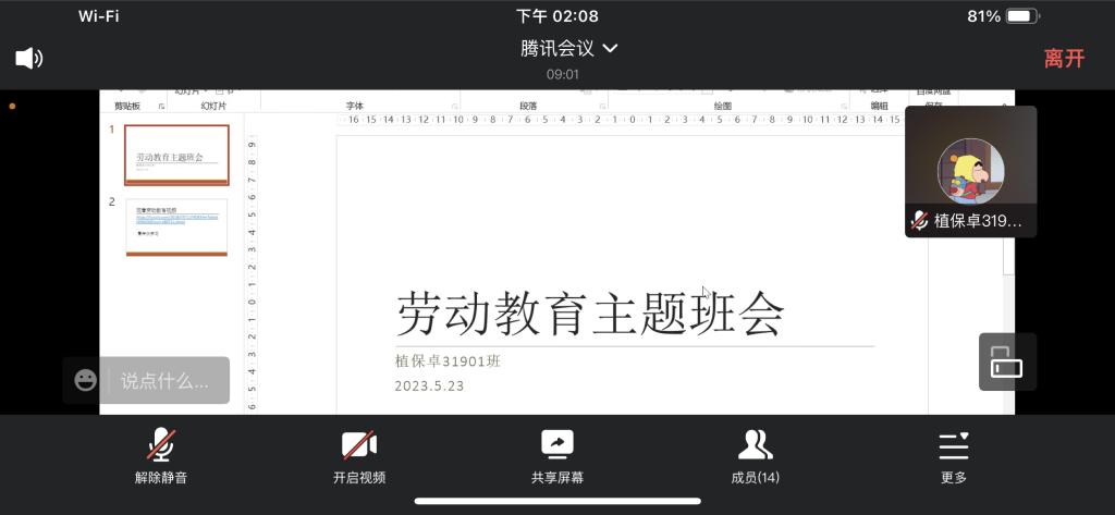植保卓31901班也积极开展了非常精彩的团会。5月23日,团支部副书记宋淑捷及各班委在线上引领同学们开展劳动教育内容学习。会中她提到“劳动教育‘直接决定社会主义建设者和接班人的劳动精神面貌、劳动价值取向和劳动技能水平’”,鼓励同学们用劳动创造美好,用实践助力成长。临近毕业,宋淑捷也提醒大家积极完成青年大学习,准备好团组织关系转接的相关材料。