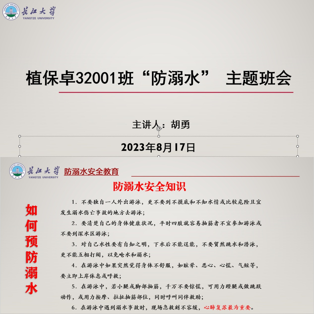 各班通过召开线上班会等多样化形式,组织全院学生学习《大学生防溺水安全常识》,并通过观看防溺水相关教育视频、收集与防溺水相关的素材等多种活动对学生进行了警示教育,给学生们列举了许多真实案例,并普及了溺水自救与救人的相关知识。
