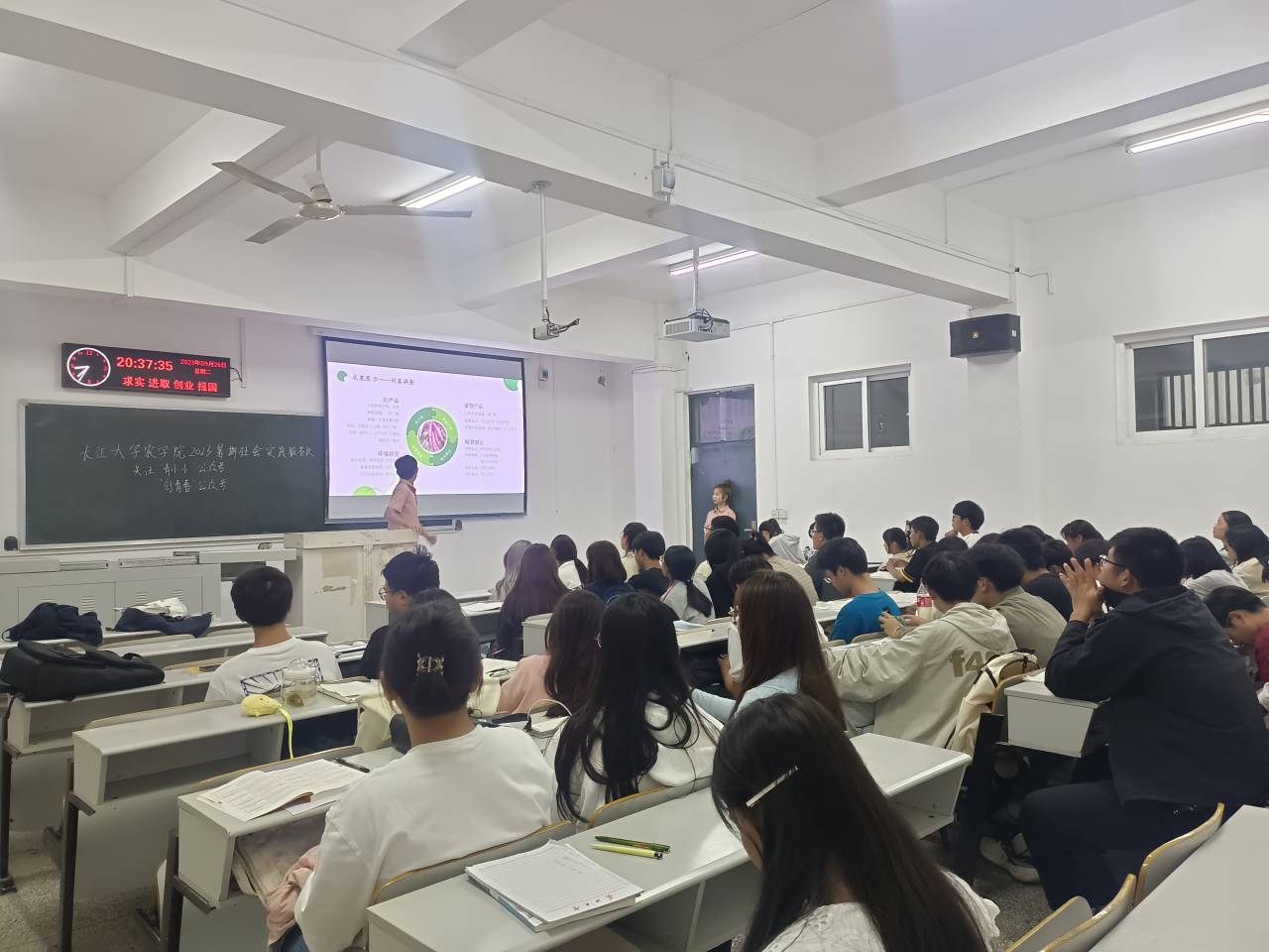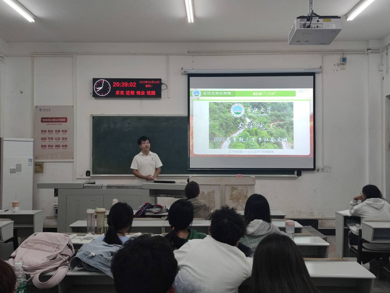 在本次分享会中,77779193永利集团暑期社会实践服务队的队员们分为了八个小组,分别到新生所在的五个自习教室进行宣讲。本次宣讲中,实践队员们从什么是“三下乡”活动、2023年暑期“三下乡”活动经验分享以及未来的“三下乡”三个方面向23级新生作了详细介绍。
