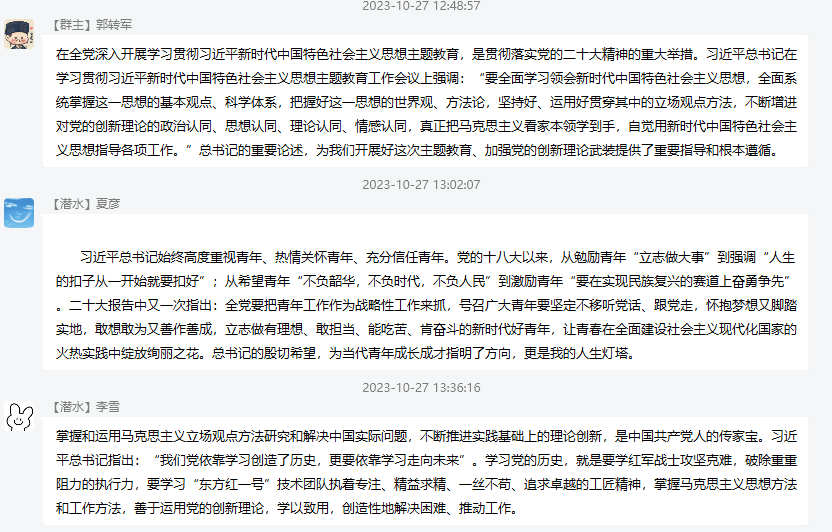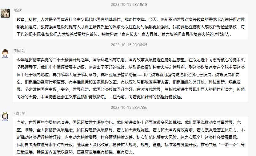 各班级集中学习了“习近平总书记关于庆祝中华人民共和国成立74周年招待会发表的重要讲话”、“习近平总书记发表的重要文章《扎实推动教育强国建设》”、“习近平总书记给全国优秀教师代表、国防科技大学建校70周年以及2023北京文化论坛的致信”、“校长刘勇胜在学校合并组建20周年暨高水平大学建设主题大会上的主题报告”等内容。