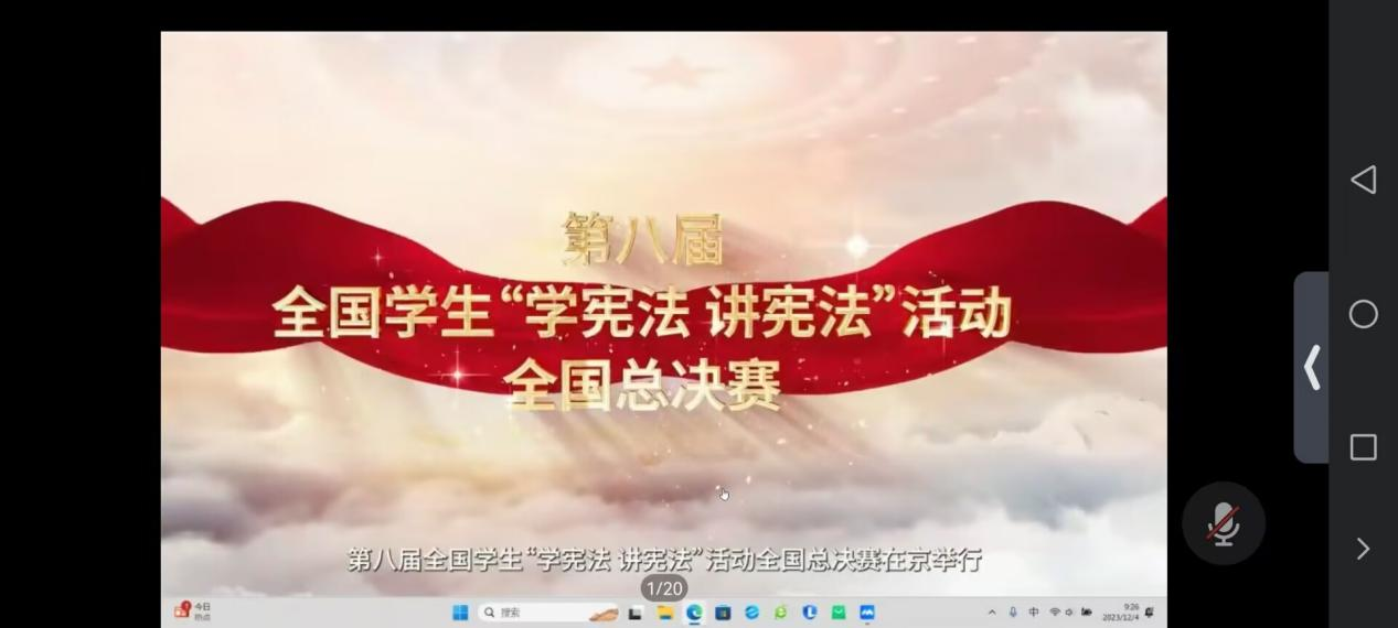 接着,主会场领唱《宪法伴我们成长》歌曲,我院同学积极跟唱这首学院传唱的活动主题曲:“红旗长扬,我们迎着朝阳;成长路上,聆听宪法雄壮的声响……”高声歌颂永牢记,法治精神沁心脾。宪法主题歌曲传唱在同学们口中,铭记在同学们心中。其后,第八届全国学生“学宪法讲宪法”活动全国总决赛演讲比赛优秀选手进行了展演。