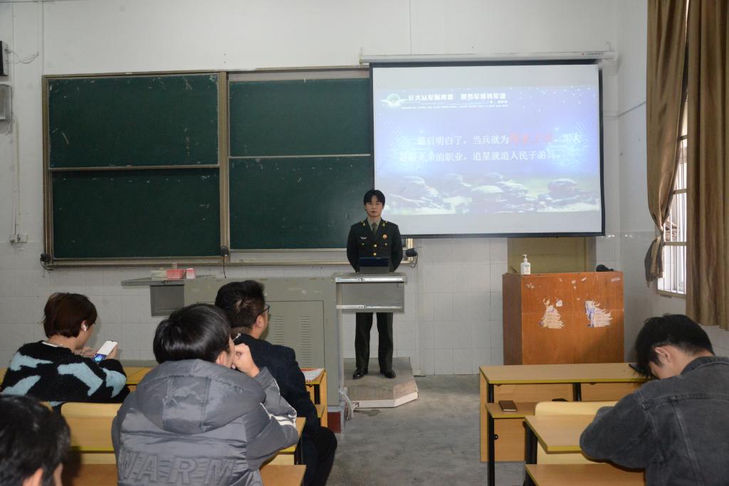 征兵宣讲员刘金城向同学们详细介绍并分析了大学生参军入伍的报名应征程序、入伍保障、部队发展、退役安置等相关政策,帮助同学们更直观、更全面、更细致地了解征兵入伍工作,并对同学们的提问进行了一一解答。