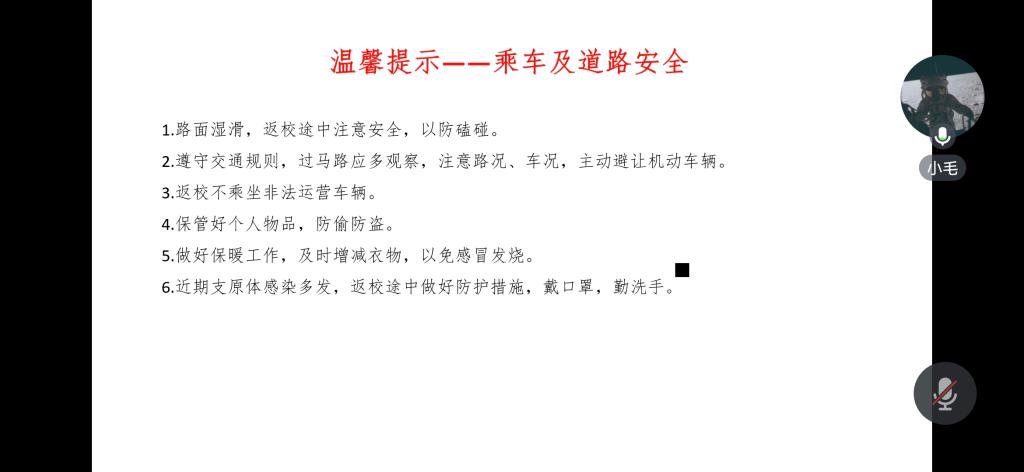 会议伊始,黄承石老师对学生安全返校工作、乘车及道路安全、提高防诈意识三方面作出了温馨提示,同时针对寒潮大风低温雨雪冰冻天气导致的出行受阻提出了解决方案——学生可联系辅导员办理延迟返校手续,学校将启动线上线下同步教学,避免学生因延迟返校耽误学业。