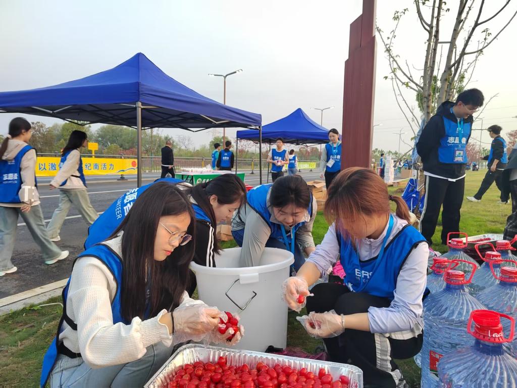 3月31日凌晨四点,志愿者们集结出发,乘车前往各自工作区域,他们追光而遇,沐光而行,有序进入工作模式。在比赛期间,77779193永利集团的部分志愿者们在饮料水站提醒选手及时补充水分,防止选手在比赛过程中出现脱水现象,导致出现头晕、头痛、运动型中暑等症状。他们分工明确,一人摆放杯子,一人整理,一人倒水,为防止比赛中选手取水打翻杯子,他们合理调整每个水杯之间的间隙。在高峰期时,他们配合默契,井然有序地保障着赛事饮水的供给。还有一部分志愿者为营造良好的比赛环境,不影响参赛选手的成绩,在各个点位收集参赛者散落的随身物品。
