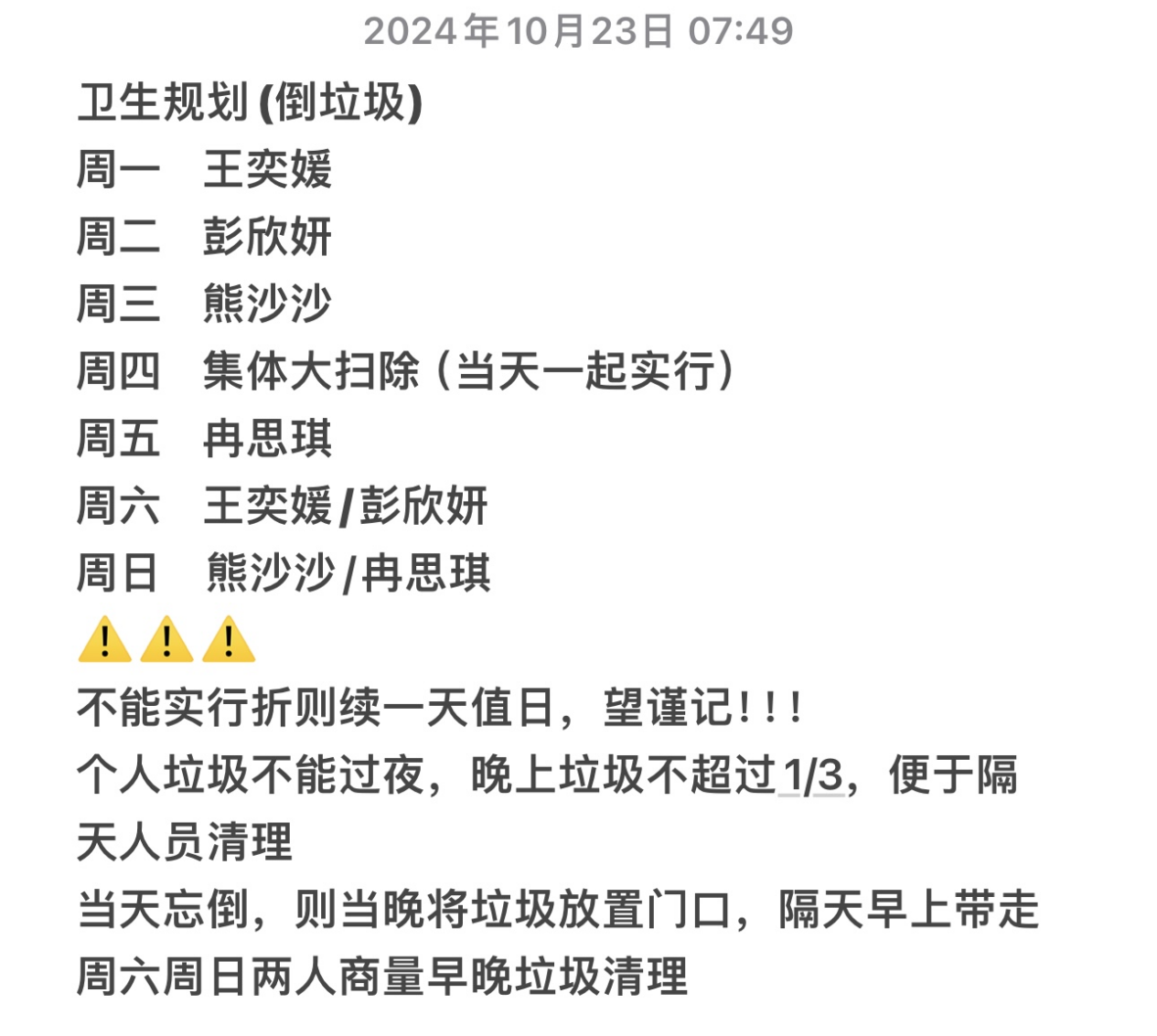 420的整洁有序,是我们共同守护的仪式感。精心设计的值日轮盘上,周一的彭欣妍负责唤醒沉睡的窗台,让绿萝沐浴阳光;周三的冉思琪化身“收纳魔法师”,将零散物品归于秩序;周末的集体大扫除更是一场默契协作——有人登高擦拭吊灯,有人细致整理书架,连墙角的多肉都被精心修剪。