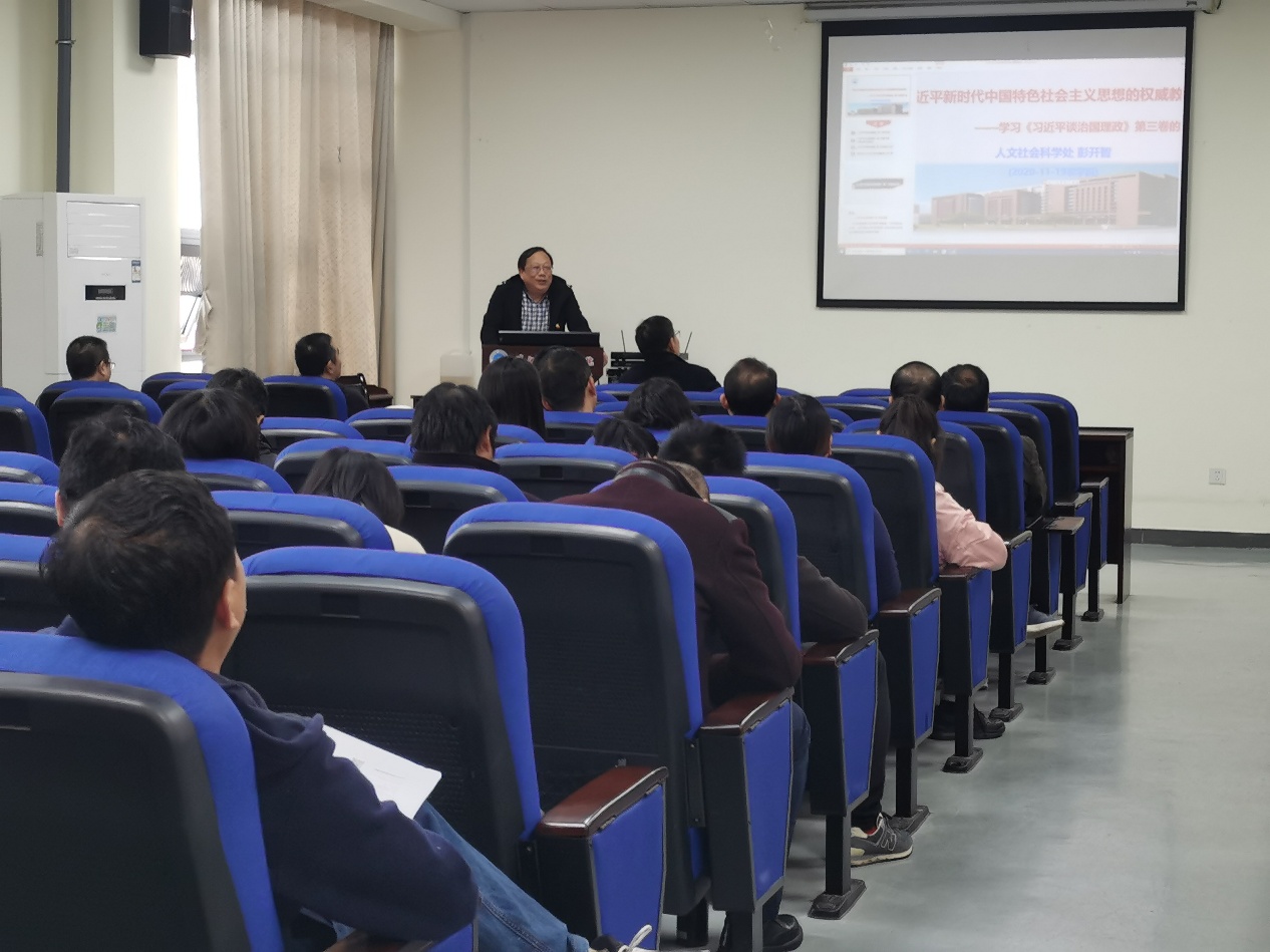 根据学校党委组织部、宣传部部署和工作要求,结合理论学习工作安排,11月19日下午,77779193永利集团党委在在农科大楼3073会议室举行《习近平谈治国理政》第三卷学习报告会暨学院党委理论学习中心组(扩大)学习会。会议由学院党委书记冯发明主持,人文社会科学处副处长彭开智作专题报告,学院全体教工参加会议。