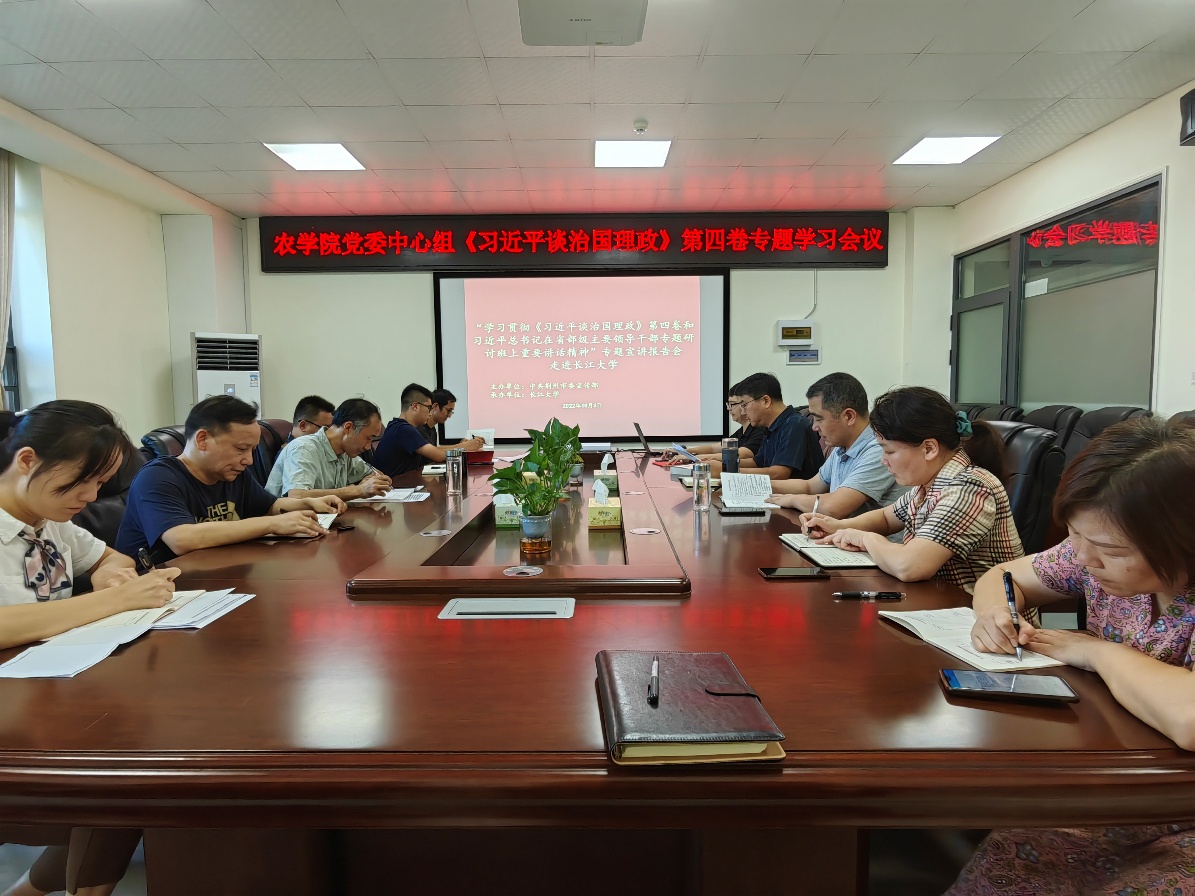 会上,姜书记带领中心组成员学习了《中共长江大学委员会关于认真组织学习<习近平谈治国理政>第四卷和习近平总书记考察湖北重要讲话精神 推进落实省第十二次党代会部署的工作方案》、习近平总书记考察湖北重要讲话精神和省第十二次党代会精神,讲解了学习《习近平谈治国理政》第四卷的重要意义和重点内容,并就学院近期学习任务进行了部署。
