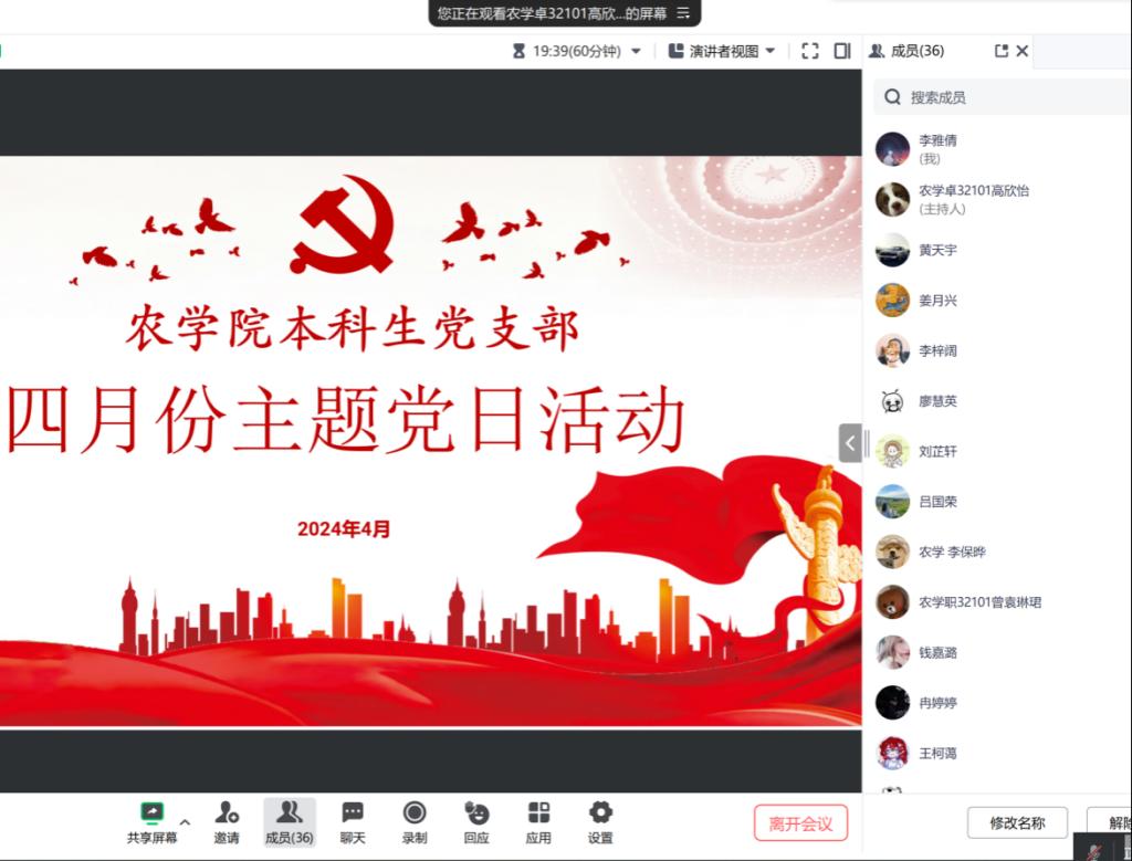(通讯员 李雅倩)4月28日20:00,我院本科生党支部在腾讯会议238-523-315开展四月份支部主题党日活动,支部全体党员参会。活动由支部副书记高欣怡同志主持。