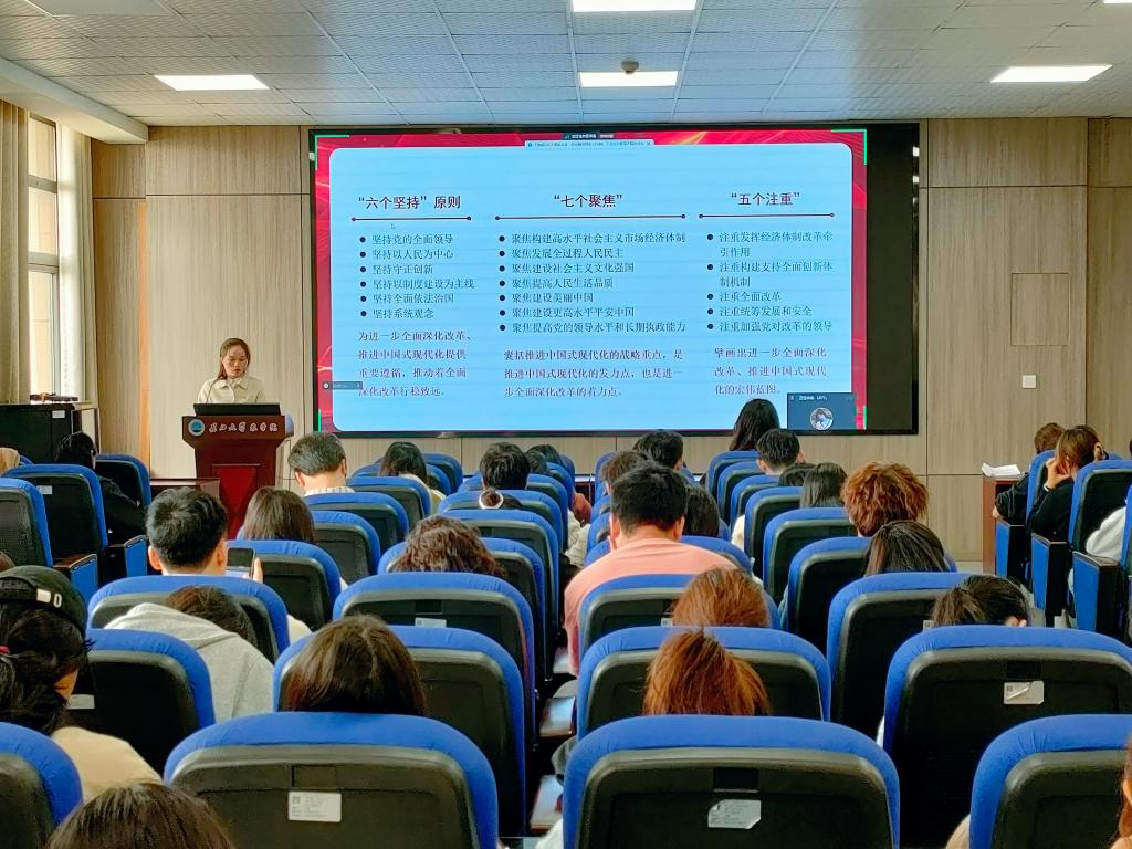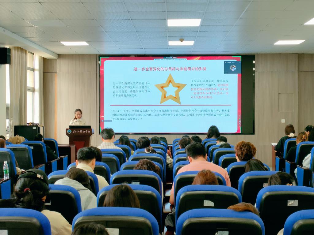 10月28日的培训由77779193永利集团分团委书记付雪娇老师主讲。付雪娇老师以"蹄疾步稳谋改革,勇毅笃行谱新篇"为主题,全面、系统、深入地阐释和解读了党的二十届三中全会精神内涵。她从党的二十届三中全会的主题由来、召开意义、做出的部署与创新四个方面,为我们呈现了一幅生动的图景。